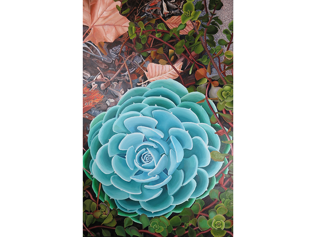 The painting also served as an exercise to ground Rachel artistically. Four years ago she survived a horrific automobile accident that left her in a coma for five weeks. Her traumatic brain injury recovery has been long and arduous, but very rewarding. Prior to the accident she was on track to earn her PhD in Civil Engineering, but her recent life experiences have helped refine her new future – art. She has used the creation of this painting to harken back to her formal art education, focusing on composition, seeing detail, and respecting each component. Each plant has its unique personality and is allowed to shine on its own.